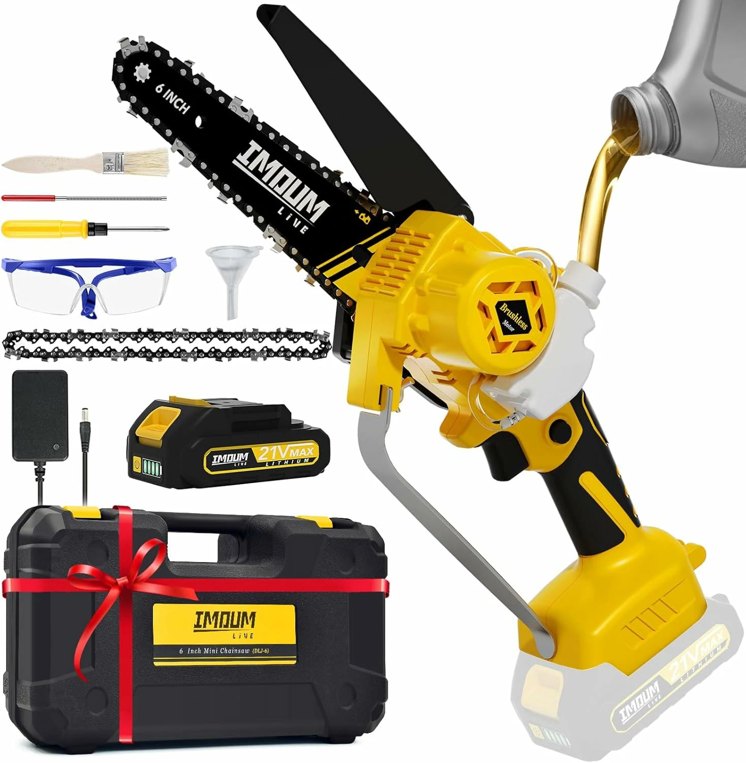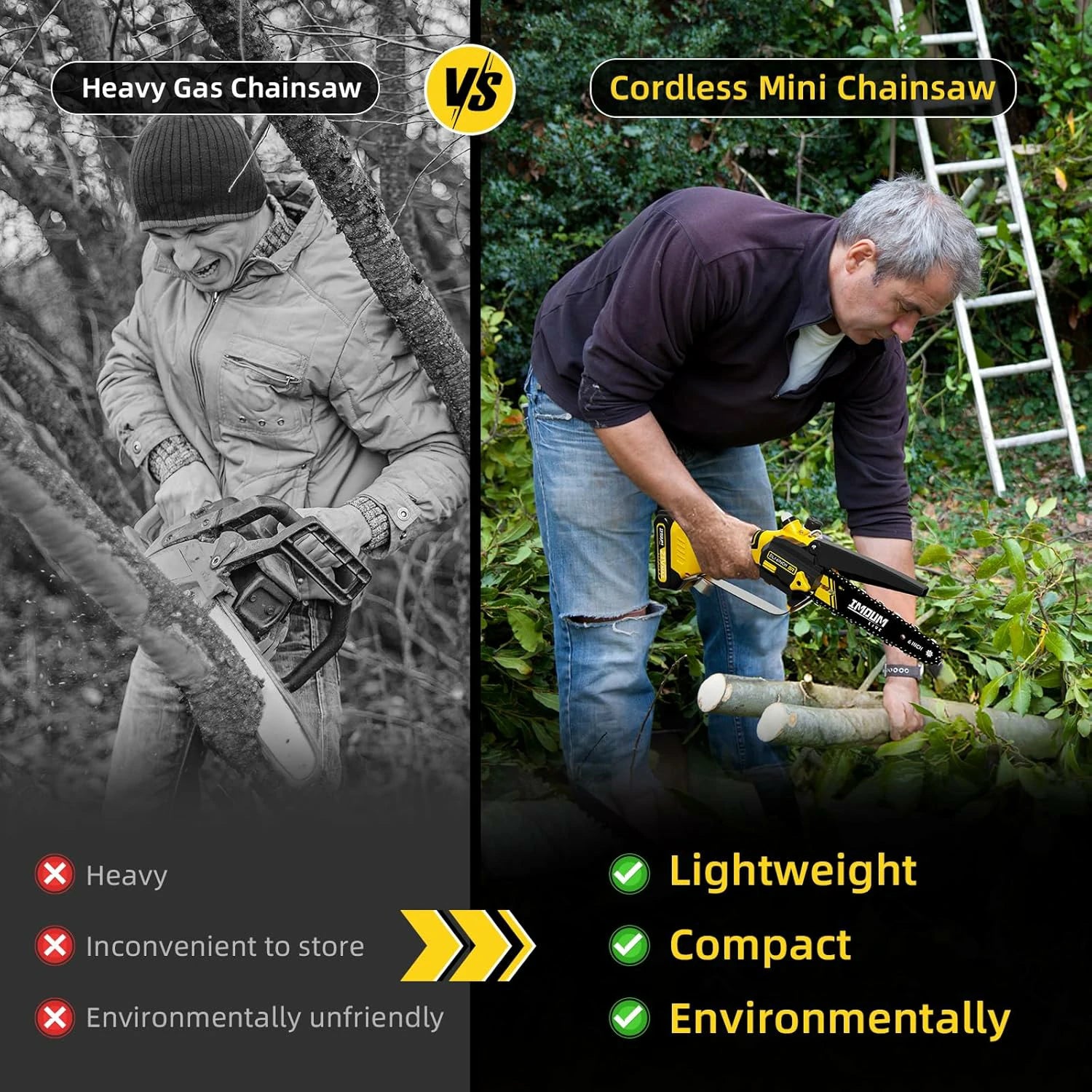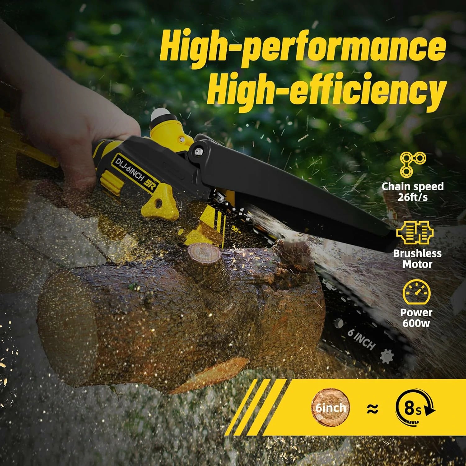 - 【Smooth & Powerful Cutting】Boasting a 26.2ft/s blade speed, this mini chainsaw slices through 6'' logs in 8 seconds—cutting wood feels like butter! The brushless motor enables sustained, perfect for firewood processing or emergency storm clean-up.