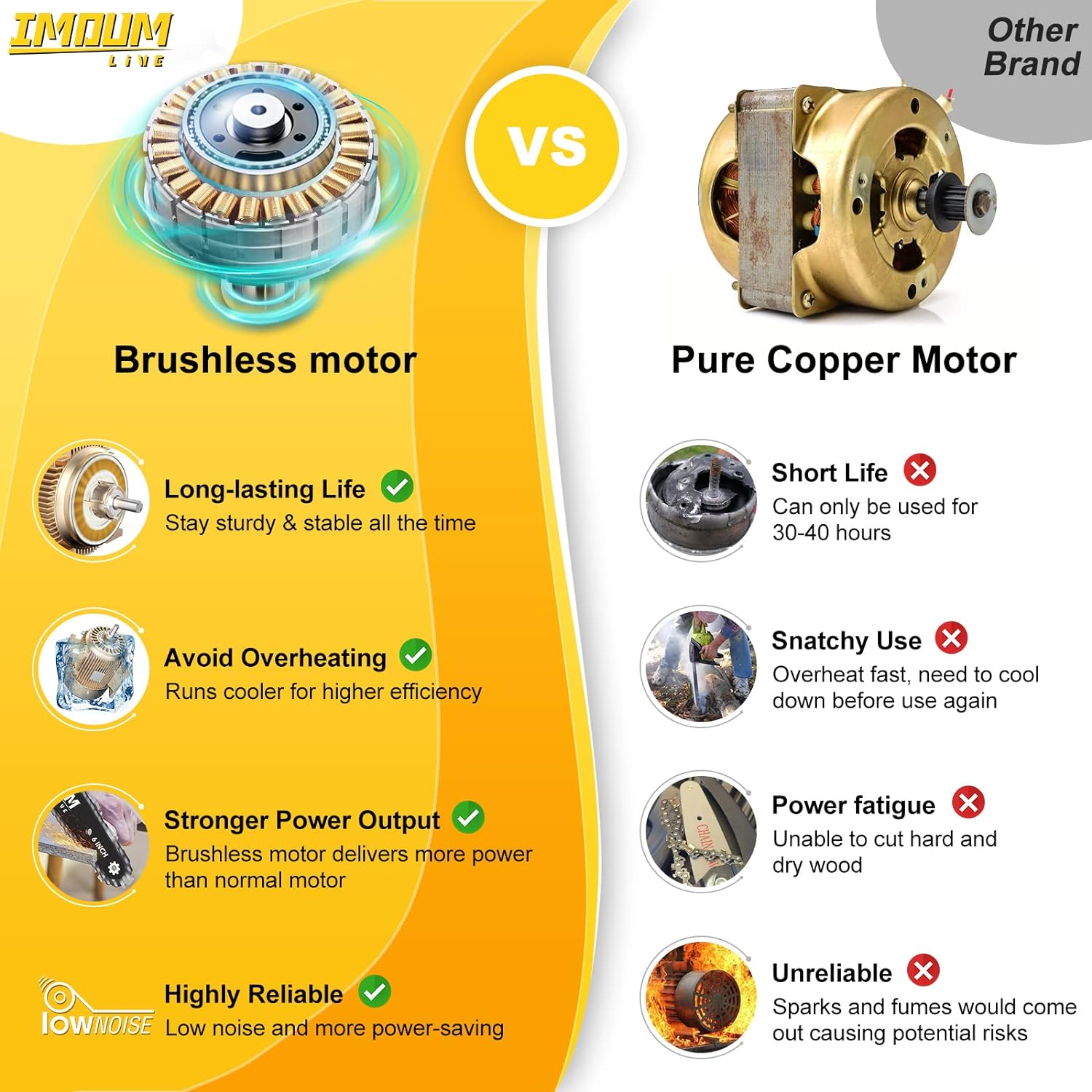 • 【High Power Brushless Motor & & Trimming Powerhouse】When you choose our IMOUMLIVE brushless chainsaw, you will get a more professional product. The upgraded chainsaw has 330% longer lifespan, 80% higher output power, 60% lower energy consumption, and 230% higher work efficiency than other chainsaws using brushed pure copper motors. Choose this versatile cutting pole saw with hard core material and variable frequency brushless motor to enjoy low-noise, high-efficiency cutting jobs.