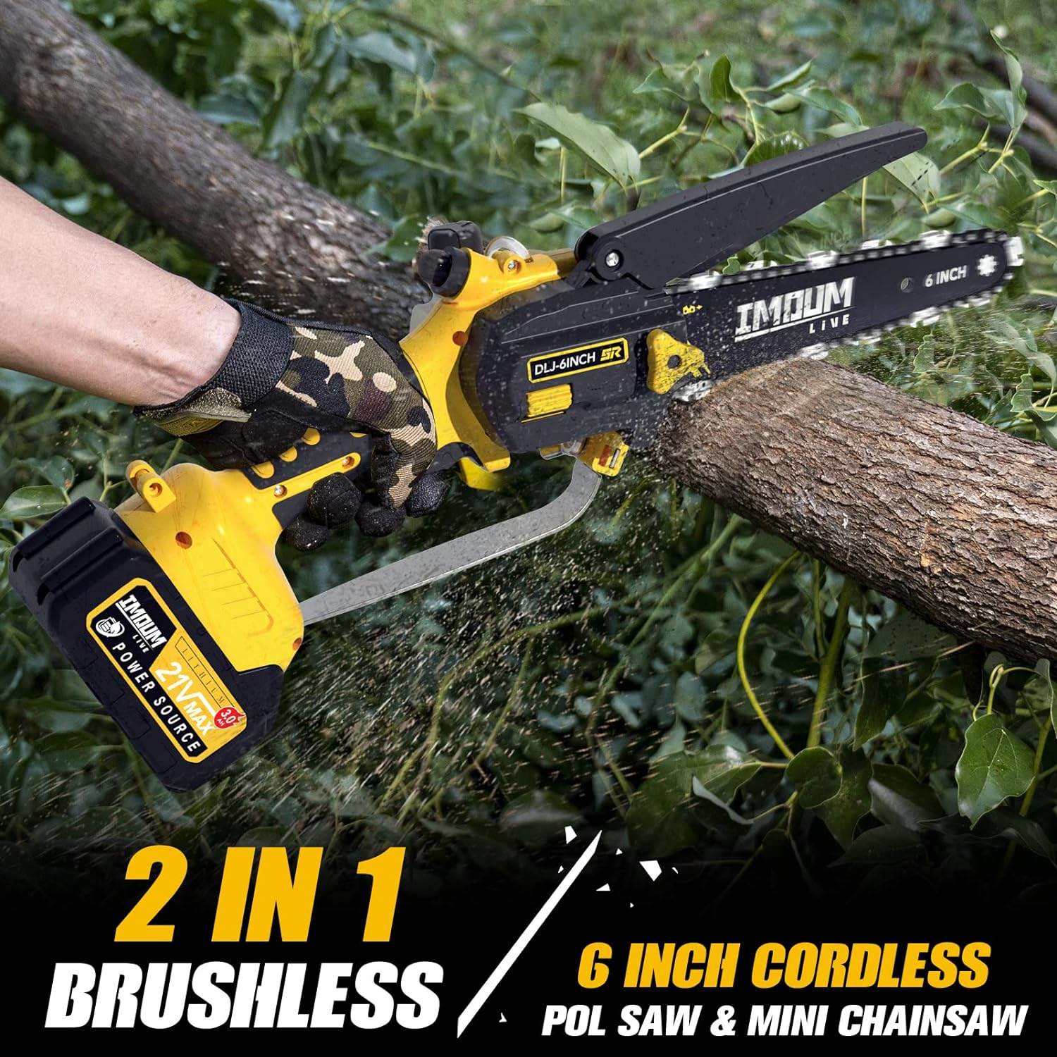 • 【Upgrade Cordless Rotatable Pole Saw & 6-Inch Chainsaw Combination】IMOUMLIVE has made a new upgrade to the 6-inch brushless chainsaw with an additional rotatable, multi-angle cutting extension bar (which can be installed and used at will according to the actual situation). You can either use the chainsaw alone to trim low branches, or install the extension pole to handle overhead work. One tool has two uses to meet the needs of users in different work scenarios.