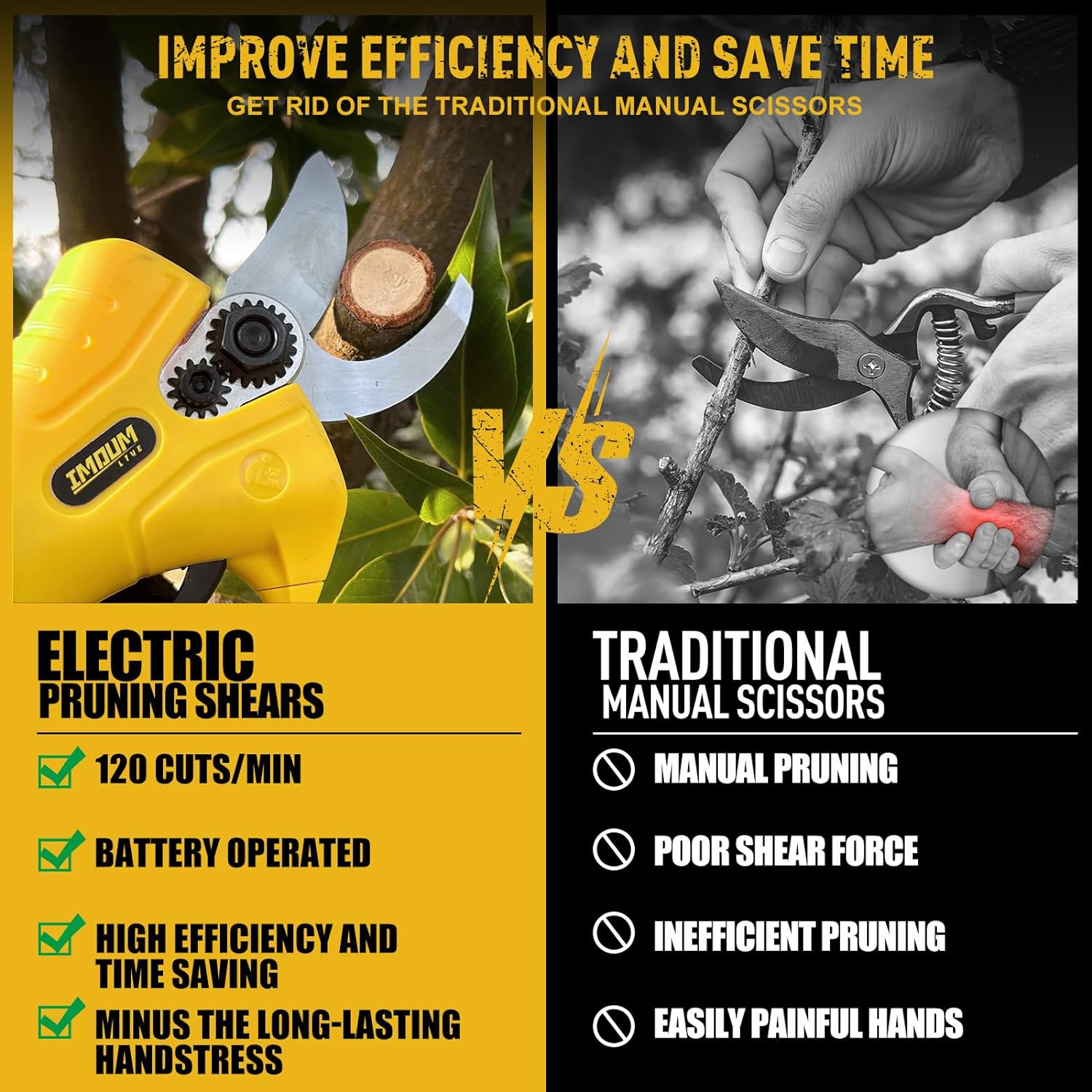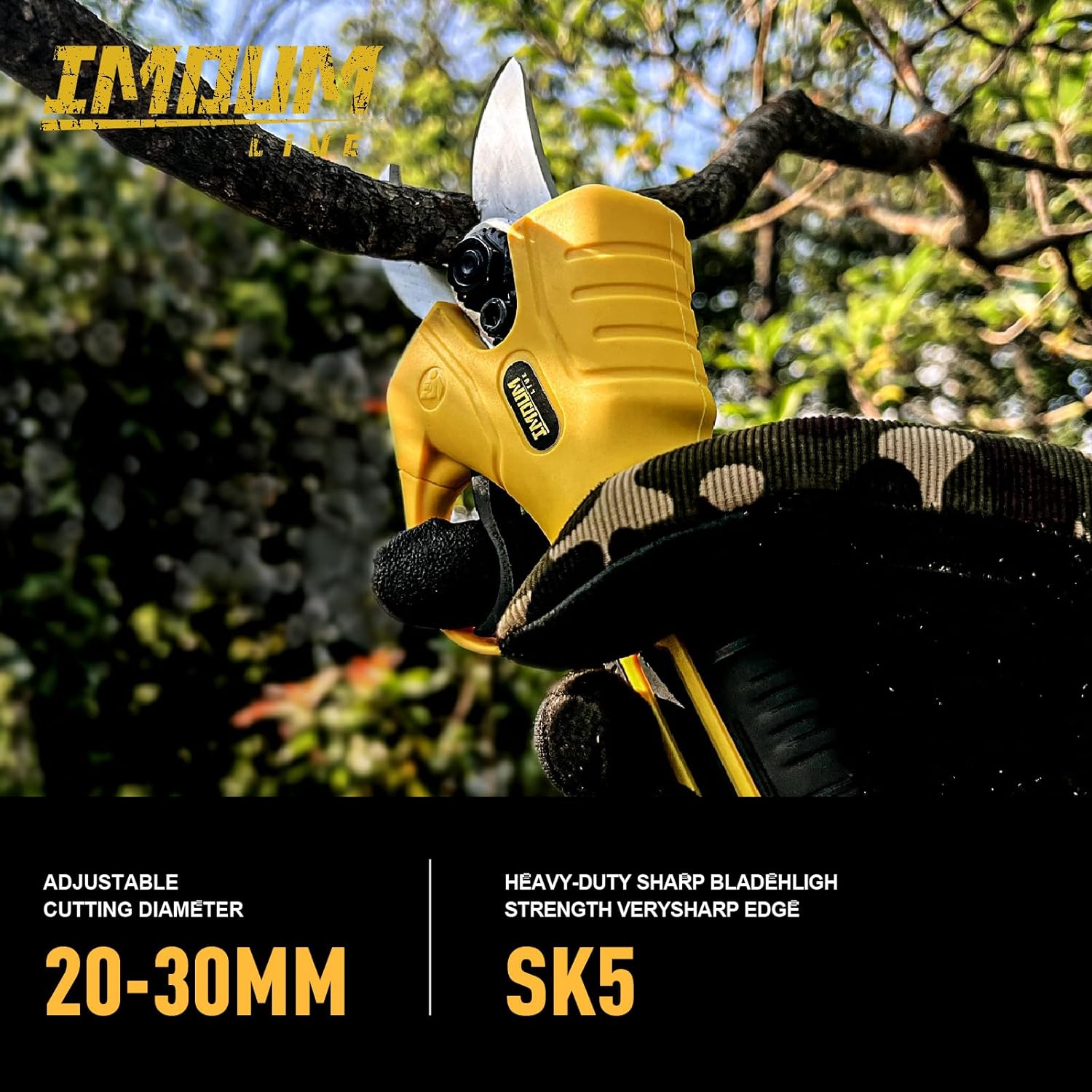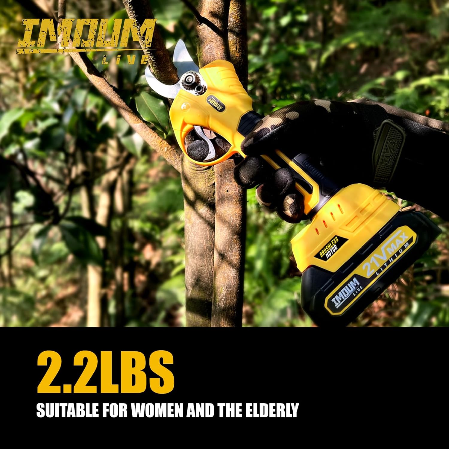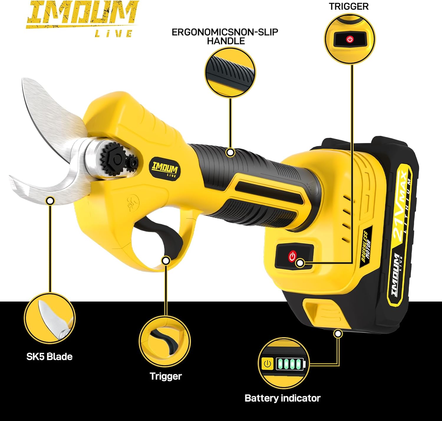 - EFFICIENT CUTTING: When you opt for the IMOUMLIVE Cordless Pruning Shears, you're choosing a more professional product. This electric pruning shear features a powerful brushless motor for extended lifespan, providing low noise and high-efficiency cutting performance. The pruning shear's blades are crafted with advanced SK5 high-carbon steel, ultra-sharp, rust-resistant, and highly durable, enabling effortless cutting of branches up to 0.8-1.2 inch in diameter