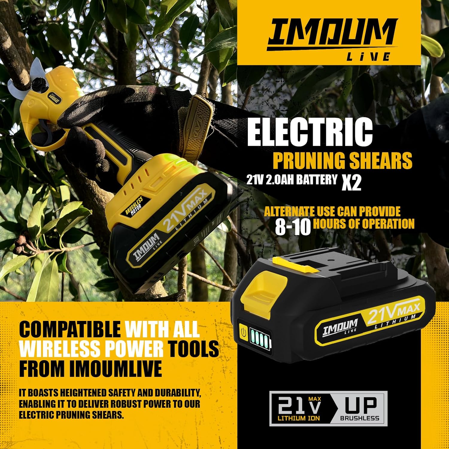 - COMPATIBILITY: IMOUMLIVE lithium-ion batteries are compatible with all IMOUMLIVE tools. The batteries feature battery status display and protection against overheating, overcharging, and explosions. Using 2x21V 2.0Ah batteries alternately allows continuous pruning for 8-10 hours. The electric pruning shears can also be used with the IMOUMLIVE telescopic extension pole, extending from 4.6 ft. to 9 ft. significantly increasing the pruning reach (THE EXTENSION POLE NEED TO BE ORDERED SEPARATELY)